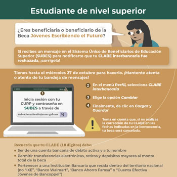 General Beca Federal de Apoyo a la Manutención 2021-II 14 octubre, 2021 por TecNM Campus P'urhépecha En seguimiento a lo establecido en la convocatoria de la Beca Federal de Apoyo a la Manutención 2021-II, en específico lo relacionado al apartado REQUISITOS GENERALES, numeral: 5. “Contar con una CLABE Interbancaria registrada en el SUBES.” Y el apartado CARACTERÍSTICAS DE LA BECA, tercer y cuarto párrafo: “Para recibir el pago de la beca, los/as estudiantes deberán […] Lea más »