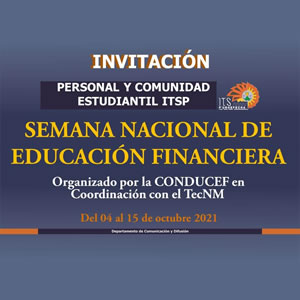 Noticias y Eventos Semana Nacional de Educación Financiera 11 octubre, 2021 / 11 octubre, 2021 por TecNM Campus P'urhépecha Atenta invitación a todo el personal y comunidad estudiantil del ITSP., a las conferencias: La inversión al alcance de los universitarios, el día martes 12 de octubre de 2021, a las 10:00 horas, impartida por el Mtro. Felipe Aranda López. Todo ello en el Marco del XXI Aniversario del TecNM Campus P’urhépecha. Enlace de acceso […] Lea más »