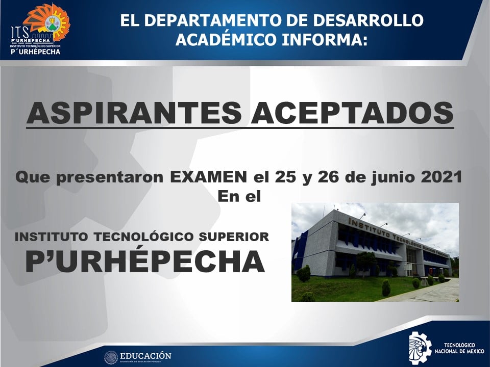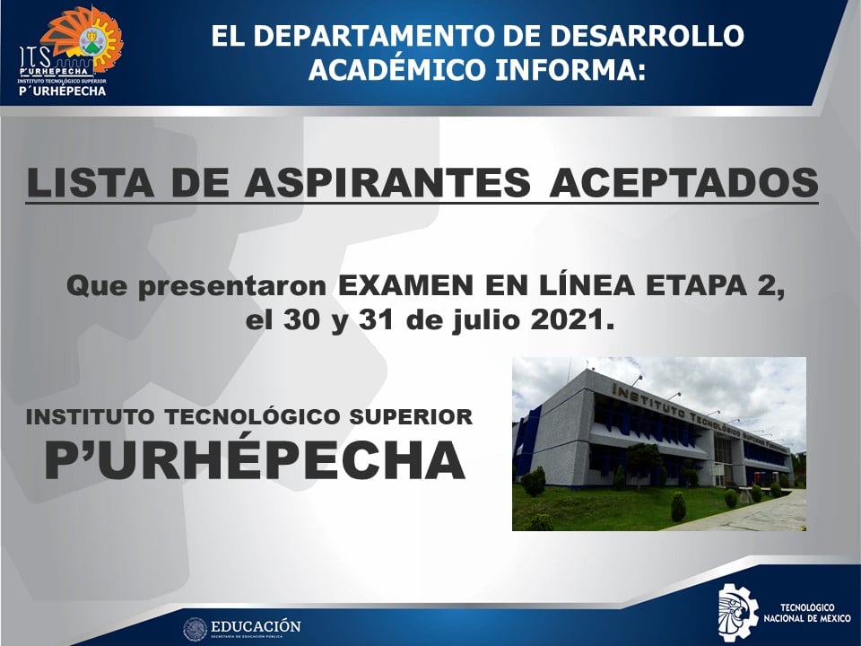 General Lista de aceptados que presentaron examen el 30 y 31 de julio 2021 2 agosto, 2021 / 2 agosto, 2021 por TecNM Campus P'urhépecha A todos los aspirantes que presentaron EXAMEN EN LÍNEA ETAPA 2 el 30 y 31 de julio 2021, se comparte la lista de aceptados: NOTA: Los cursos en línea: Moodle, inducción y propedéutico, darán inicio el 3 de agosto 2021 (obligatorio para los de modalidad presencial), el horario y el link de acceso se compartirá […] Lea más »