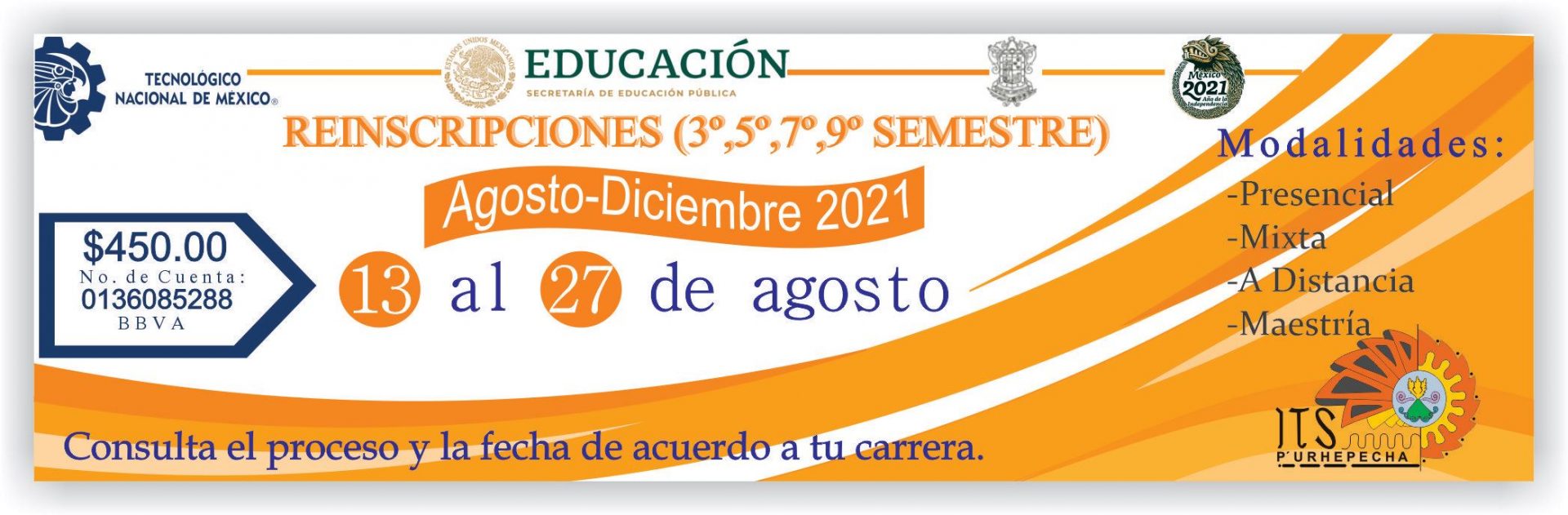 General Reinscripciones Agosto-Diciembre 2021 11 agosto, 2021 / 12 agosto, 2021 por TecNM Campus P'urhépecha Se notifica atentamente que el proceso de reinscripción agosto-diciembre 2021, será 𝗲𝗻 𝗟Í𝗡𝗘𝗔 para todas las carreras y modalidades: Realizar el pago, llenar y enviar el formulario: https://its-purhepecha.edu.mx/pagos/ del 13 al 18 de agosto 2021. Carga de materias en el SII: Del 23 al 27 de agosto 2021, de 9:00 a 13:00hrs. Ver calendario ¡Revisa […] Lea más »