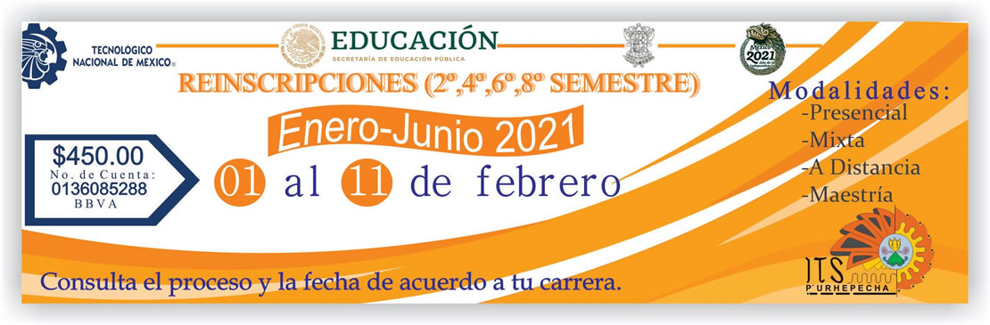 Archivos Reinscripciones Enero-Junio 2021 29 enero, 2021 / 20 febrero, 2021 por TecNM Campus P'urhépecha A toda la comunidad estudiantil del Instituto Tecnológico Superior P’urhépecha, se informa, que debido a la contingencia sanitaria, el proceso de REINSCRIPCIÓN PARA EL SEMESTRE ENERO-JUNIO-2021 se realizará en LÍNEA. Revisa el proceso y el calendario de acuerdo a tu carrera: Llenar el formulario en la siguiente liga: https://its-purhepecha.edu.mx/reinscripciones/ Lea más »