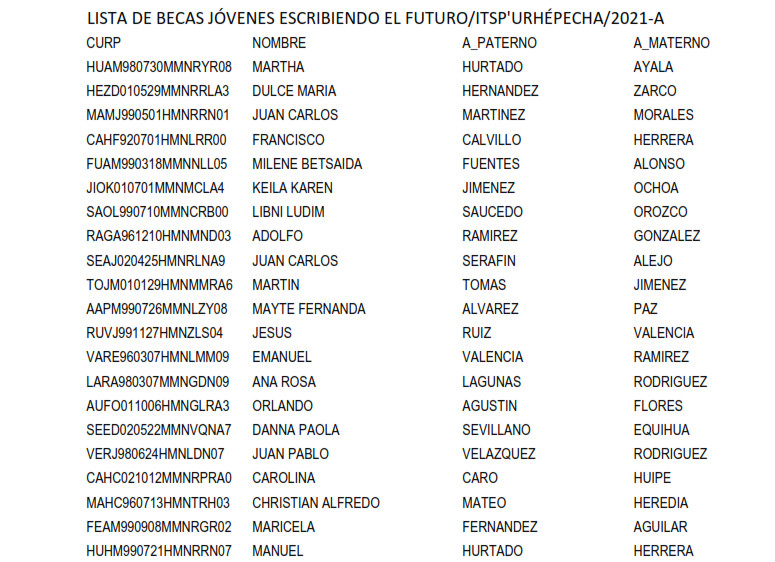 General Lista de becas Jóvenes escribiendo el futuro ITSP’urhepecha 2021-A 13 abril, 2021 / 21 abril, 2021 por TecNM Campus P'urhépecha Lea más »